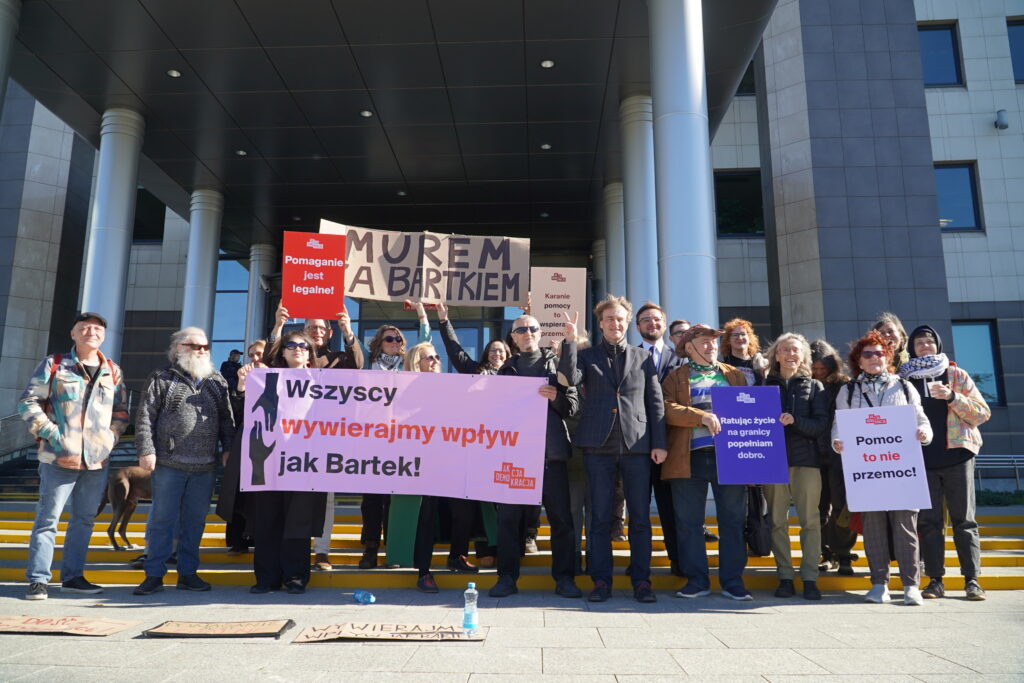 Pod Sądem Rejonowym w Białymstoku w piątek, 26 września trwała demonstracja solidarności z oskarżonym Bartkiem. Zebrani skandowali: „Nigdy, przenigdy nie będziesz szedł sam”, „Zdejmij mundur, przeproś Bartka” i „Pyskowanie jest legalne”. Pyskowanie – nie pomaganie (jak zwykle podczas demonstracji wsparcia dla aktywistów brzmi to hasło), bo chociaż Bartek od początku kryzysu humanitarnego na polsko-białoruskiej granicy jest zaangażowany w pomoc humanitarną, to pretekstem do represji były jego słowa skierowane do dwóch funkcjonariuszy z placówki SG w Michałowie: „Ale macie przejebane. Łamiecie prawo. Zostaną wobec was wyciągnięte konsekwencje”.